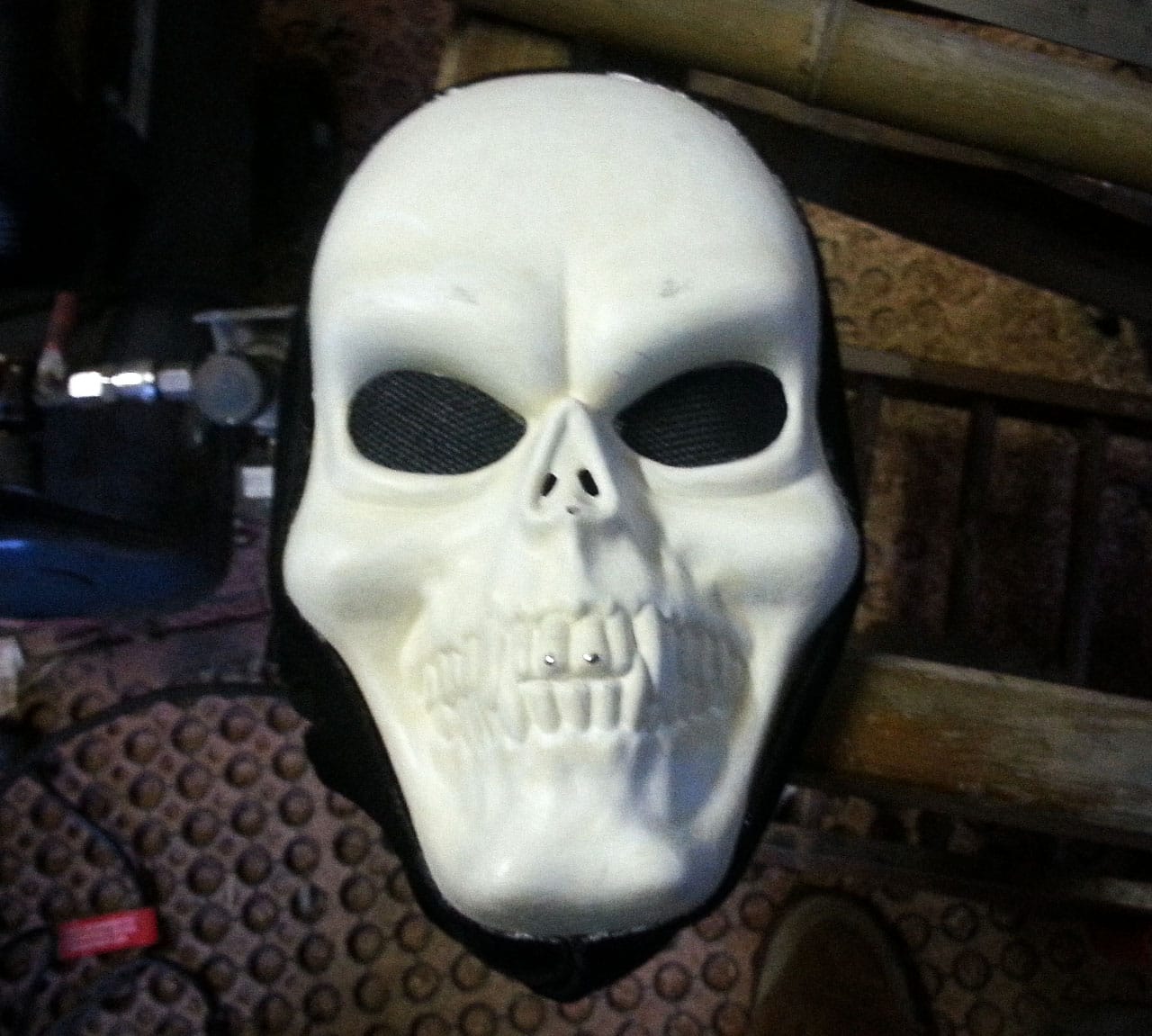 The mask was originally silver or gold in colour. It had been fitted with a hood and mesh over the eyes so the actor could see, and it had been painted white. However, the white paint would wear off each time it was placed down on a bench, leaving silver patches on the teeth that had to be repainted after every use.