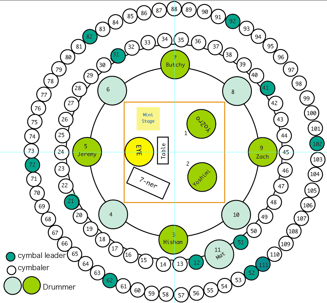 Yamantaka Eye and Yoshimi P-We stand at the centre, surrounded by giant concentric circles of drummers and cymbal players. At 11:11am, on the 11th of the 11th, 2011, the show begins.