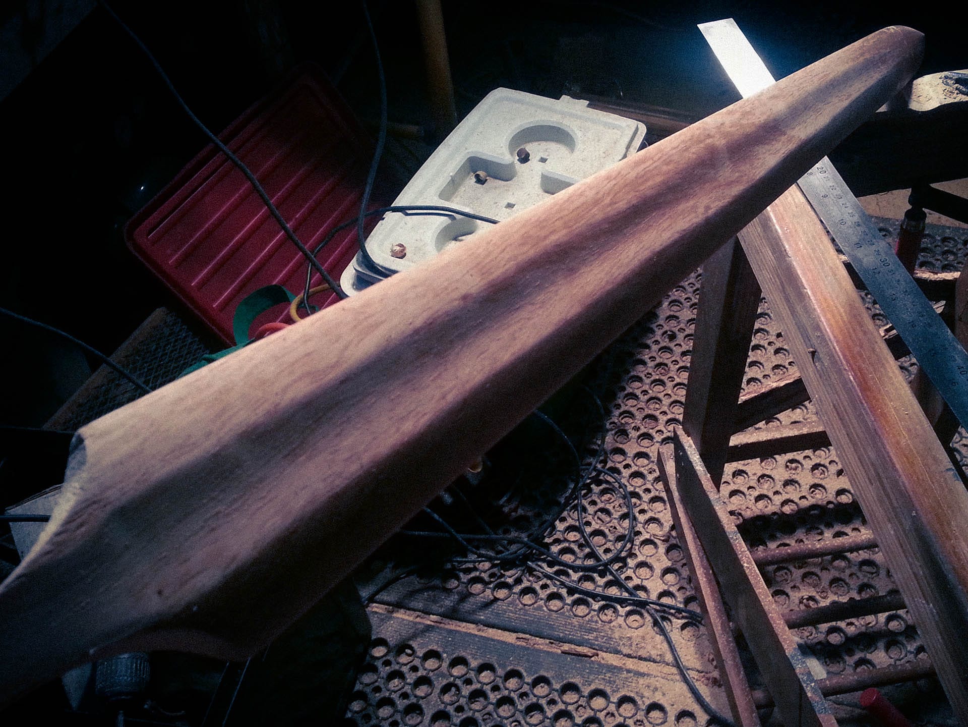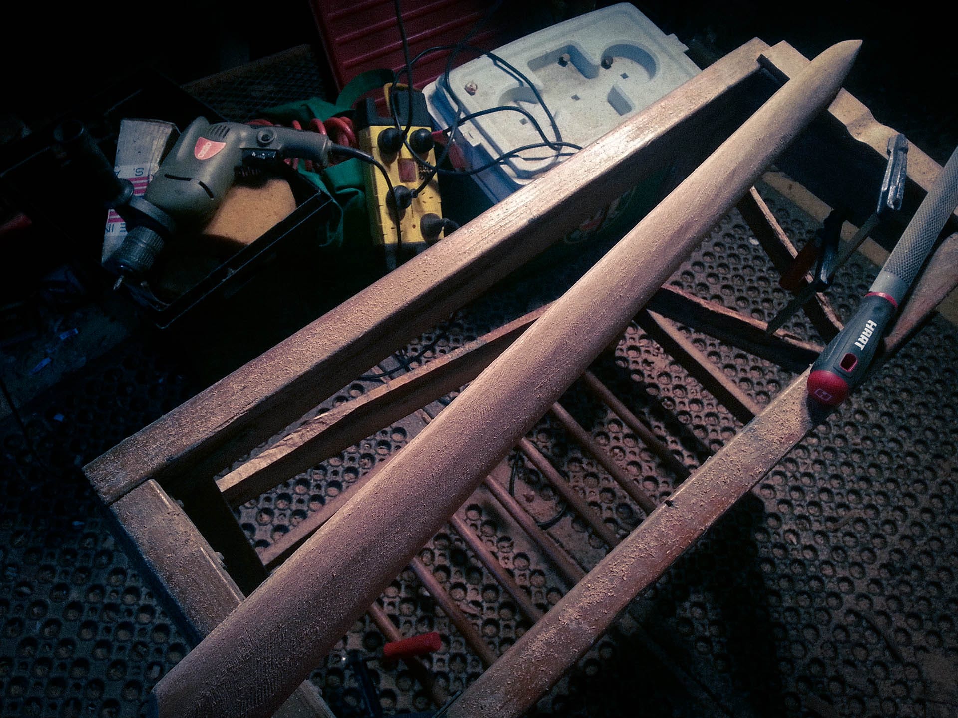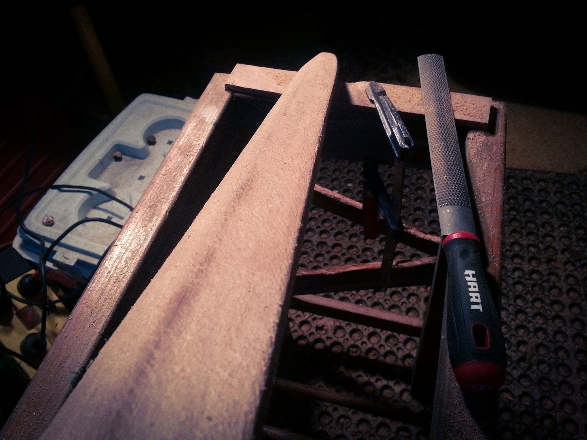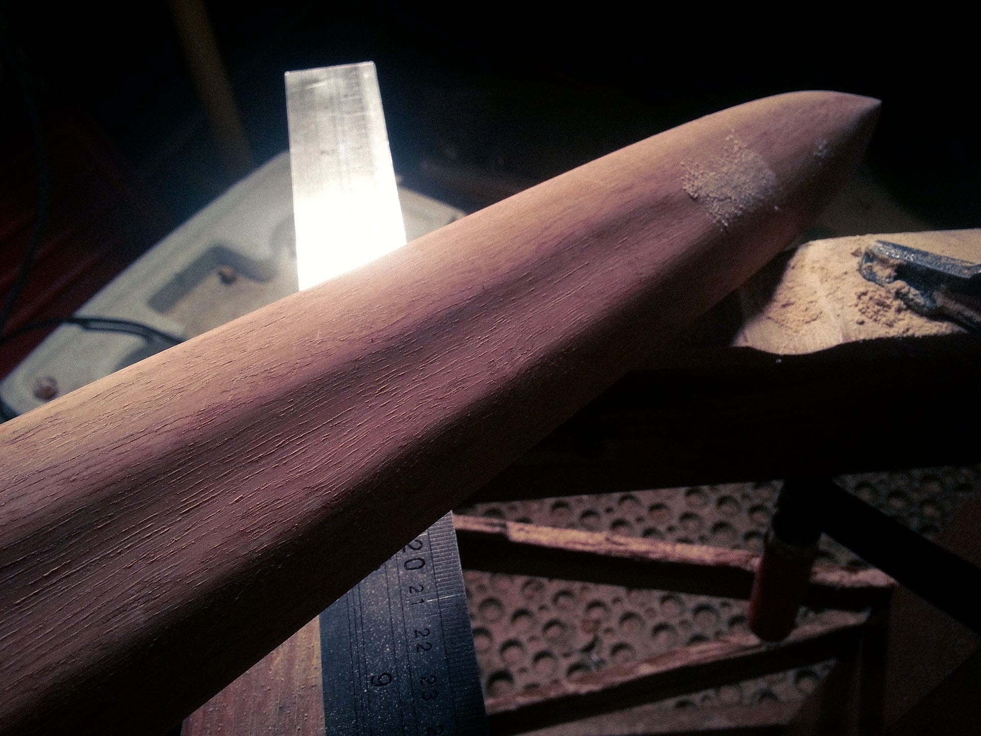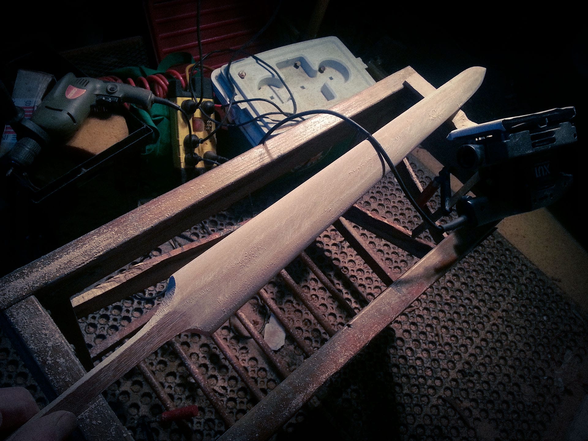 The idea was to use traditional hand tools as much as possible. However, due to time constraints, I ended up using several power tools such as an electric planer and orbital sander. The planer was used for shaping the rough blade profile, then I continued the more detailed shaping with a rasp and smoothed it out with the orbital sander.