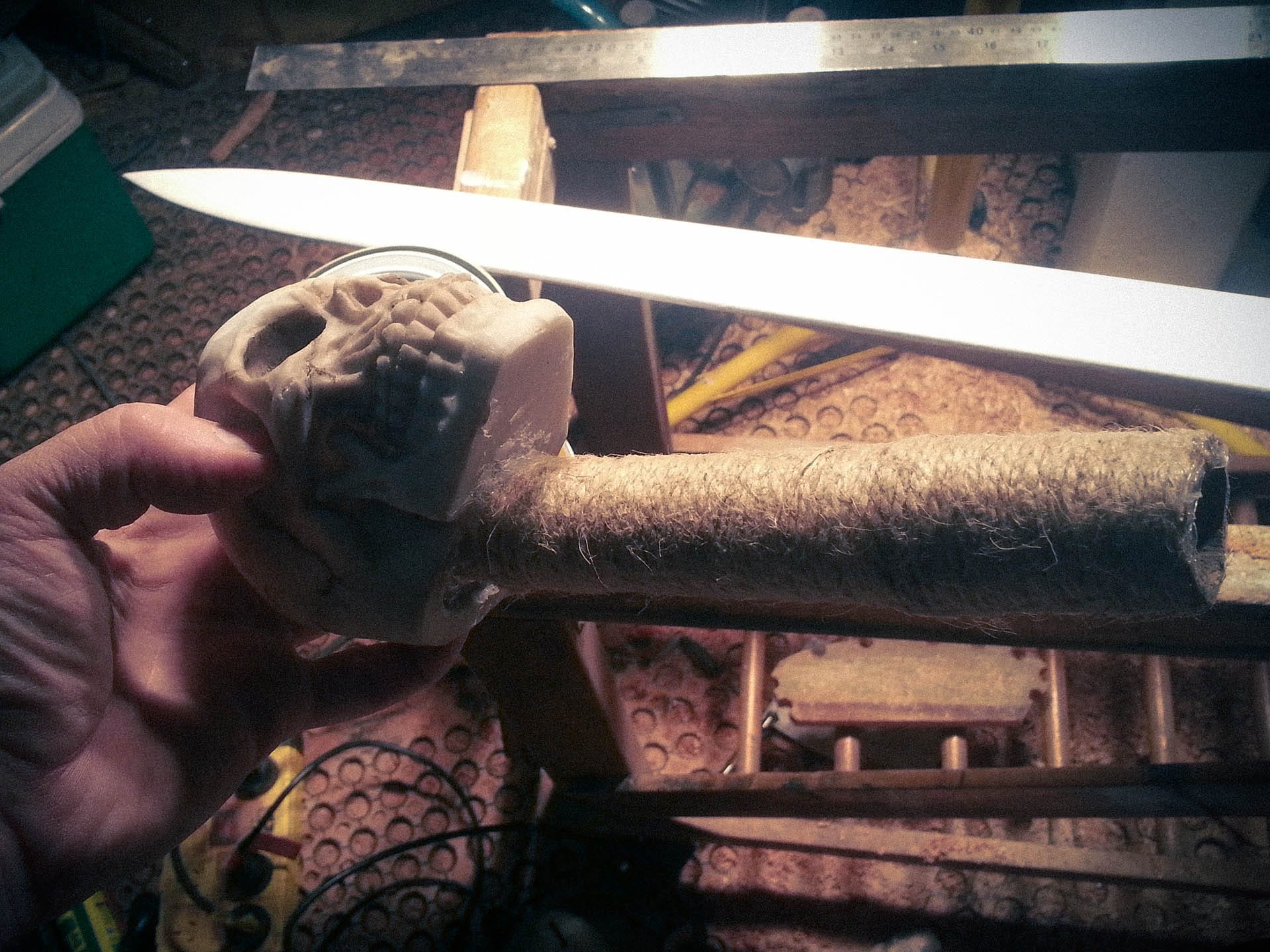 For the skull pommel, the original idea was to sculpt and cast one using Barnes Products TC-808, which is commonly used for doll heads and is super strong. But again — deadlines. So I grabbed a skull from a cheap shop for 12 bucks. It was slightly too big and had a bird on its head. Classic, right?