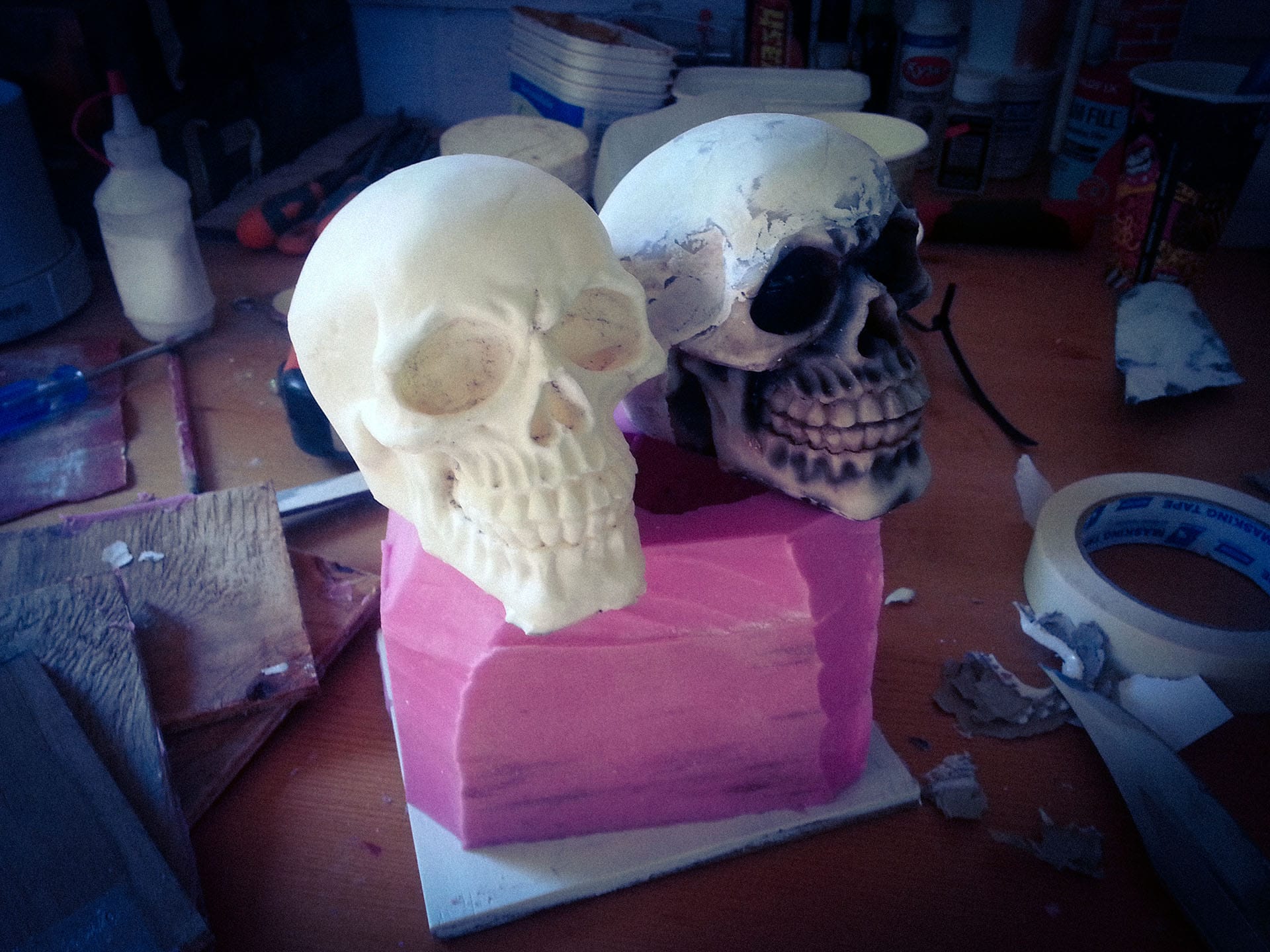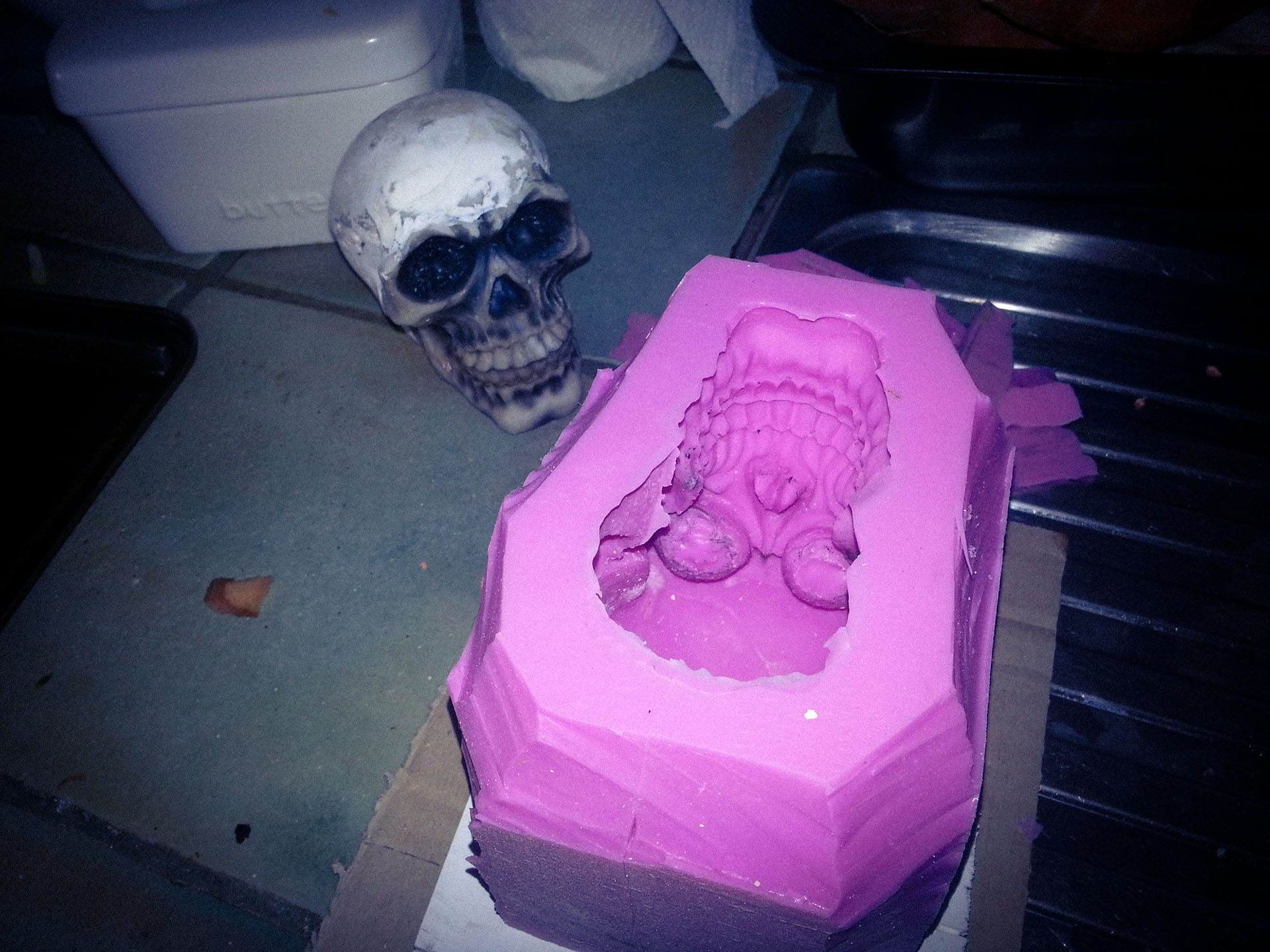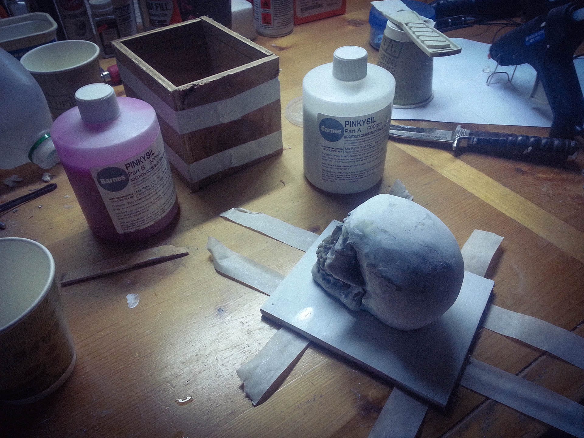 I then built a tiny box just big enough to fit the skull and used Pinkysil to make a mould of it. Pinkysil is a silicone-based two-part casting product from Barnes. It’s great for copying items like this, and I still have the mould to this day, although I only ever used it that one time.