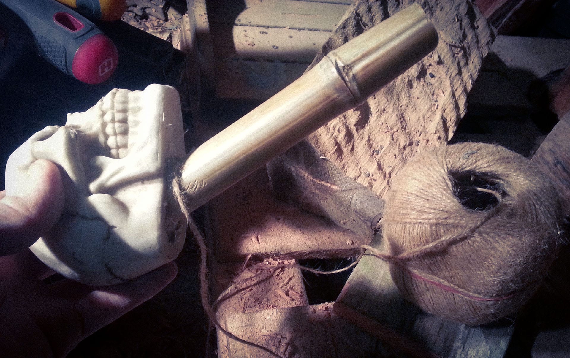 So I had to cut that off and fill the hole with a plaster-type compound, partly to repair it and partly to add weight, as it is a pommel after all. The handle was glued and plastered into place, then screws were put through the eye sockets to secure it. After that, I wrapped and glued on some twine I had left over from a previous project as the grip.