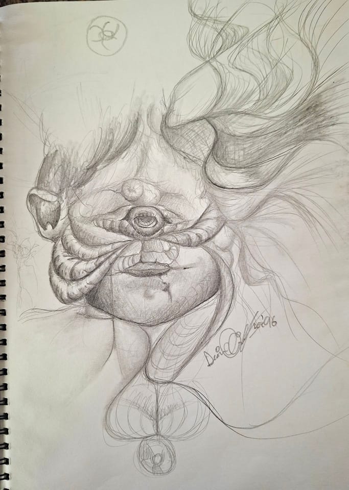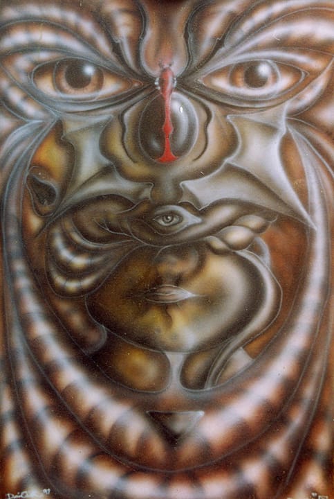 No 2. 2nd freehand painting (1996) — Acrylic on card, A1 (841 × 594 mm) (above) Heavily influenced by H.R. Giger, I pushed for a lot more detail than the previous piece. I was still using standard acrylic watered down until it would flow — not ideal for an airbrush, but it was all I could afford at the time. It caused constant blockages, and occasionally a sudden burp of paint. You can see one of those moments in the splattered highlights around the central top eye. I didn’t have the patience to fix it… so it’s still in there.