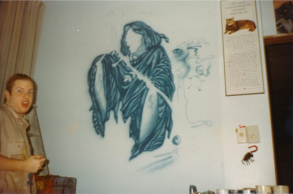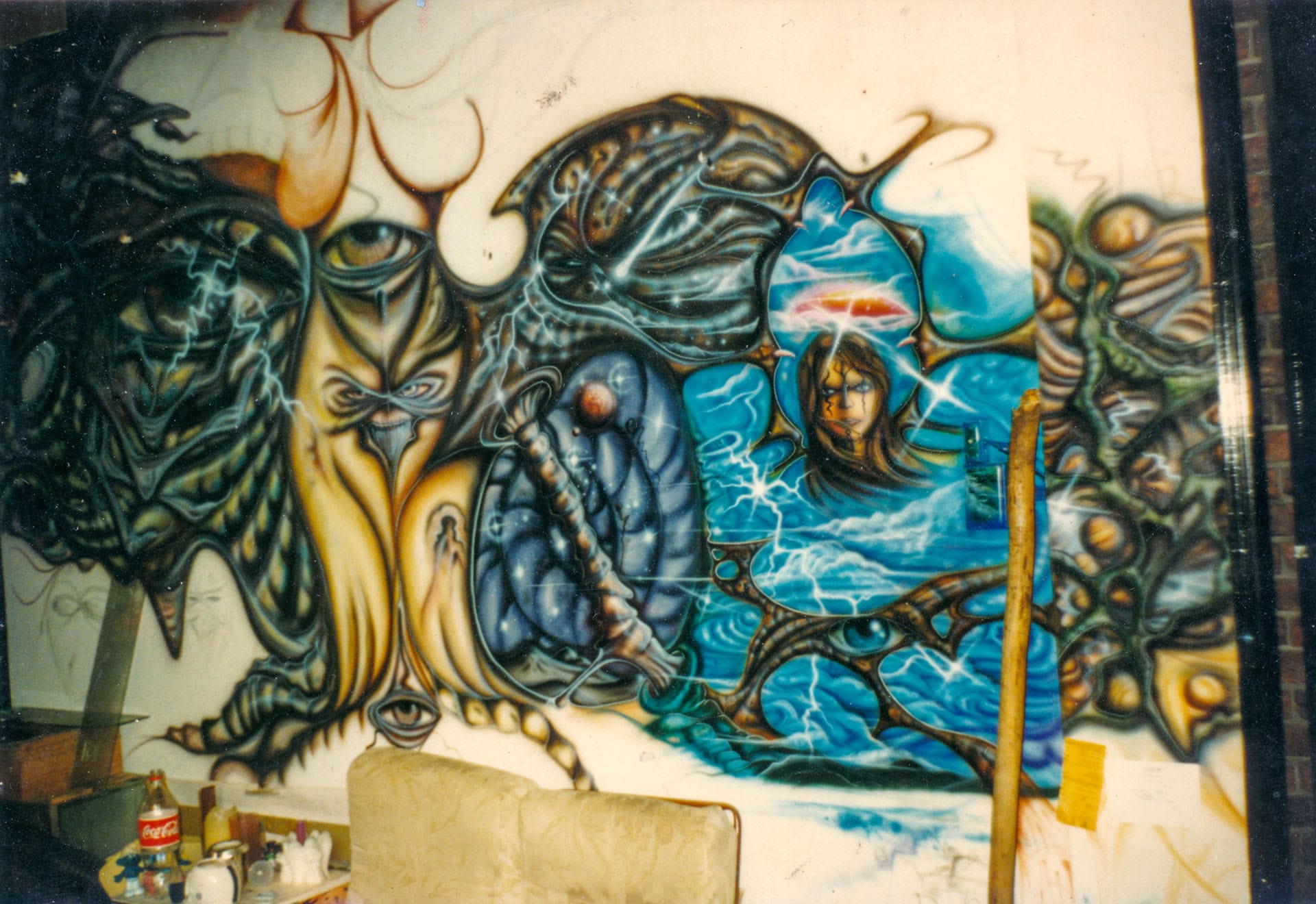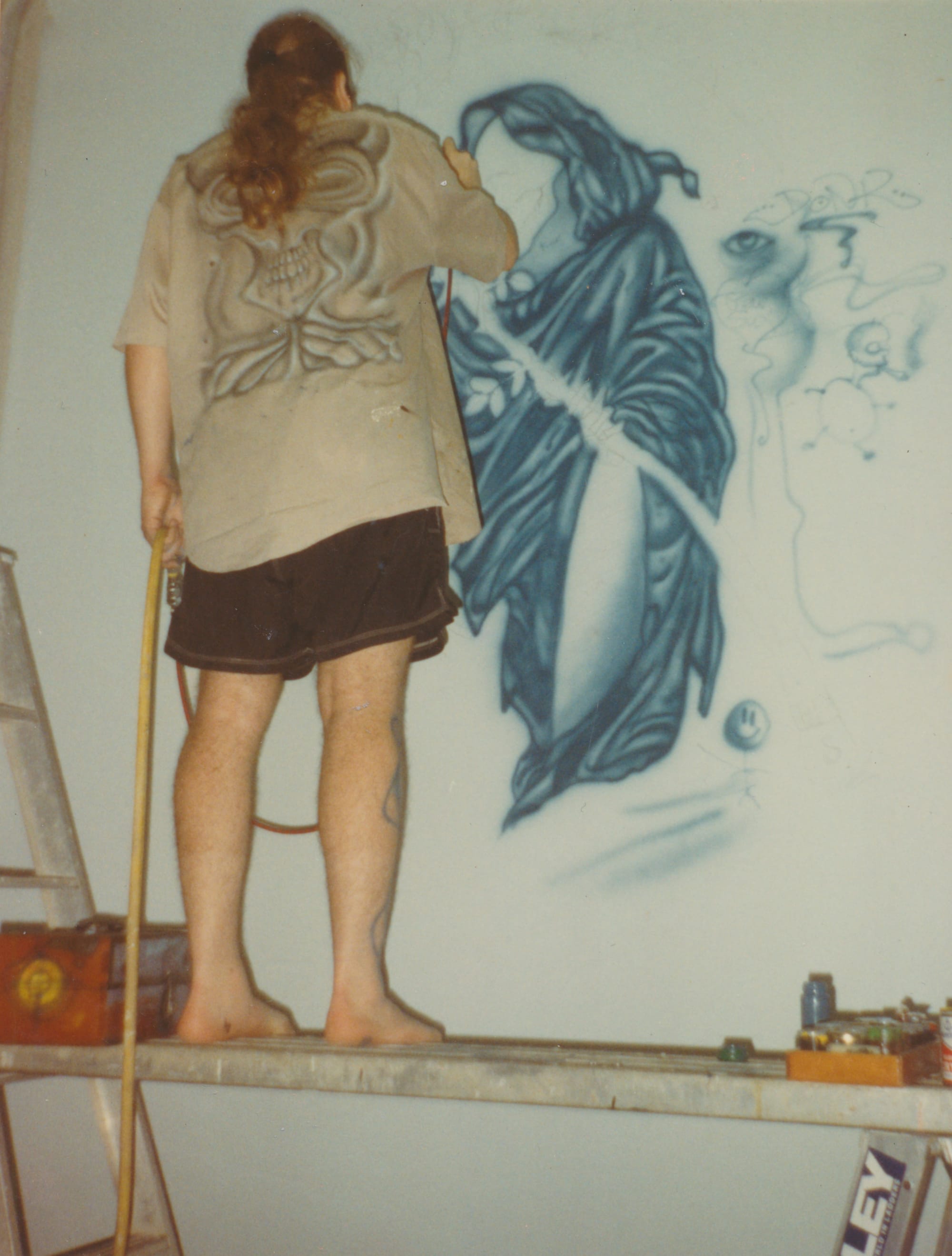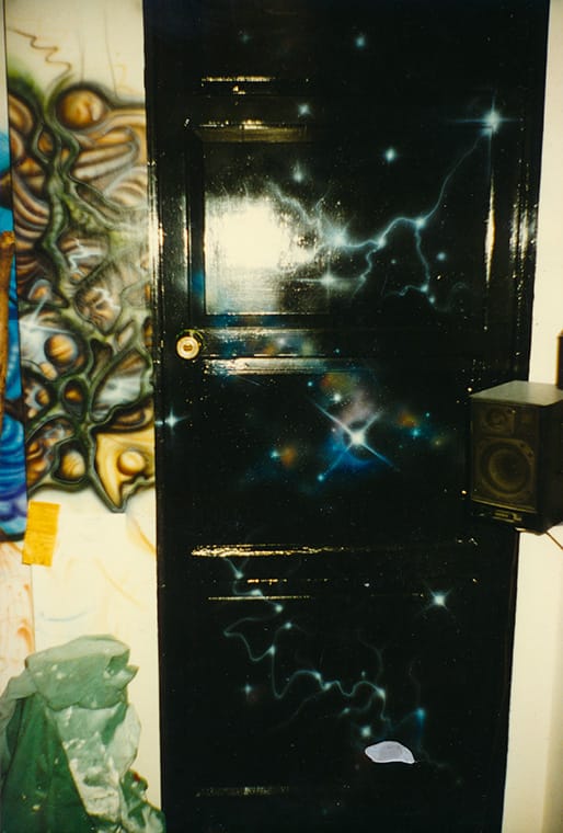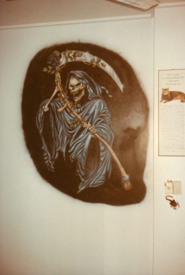 “My Bedroom” (1997) — Airbrushed acrylic on concrete (and various other surfaces) Directly behind the Death painting in my friend’s room was my room. My parents randomly decided to leave the country, so I suddenly needed somewhere to stay. My friend and his parents had a spare room, so I moved in.