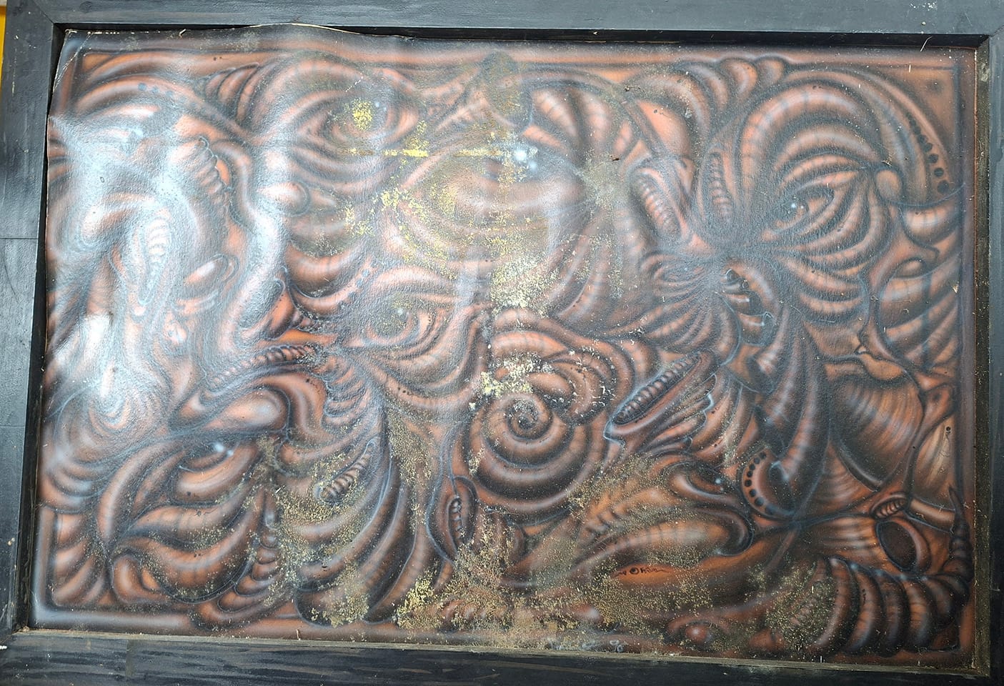 No 6. Bizarre waste of power. 1997 — Airbrushed acrylic on masonite. This one was sparked by a set of disturbing reference photos I was shown at the time — preserved medical specimens, including a “cyclops baby” image. They were claimed to be connected to Chernobyl, but I’ve never been able to verify that, so I’m treating it as part of the story of how the reference found me, not a statement of fact. Everything beyond that central idea is artistic licence. It also ended up with a custom frame, with runes burned into the timber using a soldering iron. (I will update this post when I find where it is)