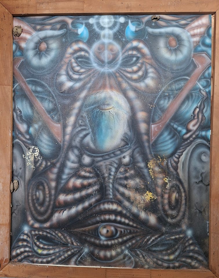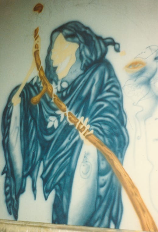 “Death” (1997) — Airbrushed acrylic on concrete I was living at a friend’s place at the time, and they let me paint on a couple of the walls. This one was based on an artwork I’d seen on a postcard, enlarged by hand (no projector back then). The plan was to paint the rest of the wall black… but I’m not sure it ever happened.