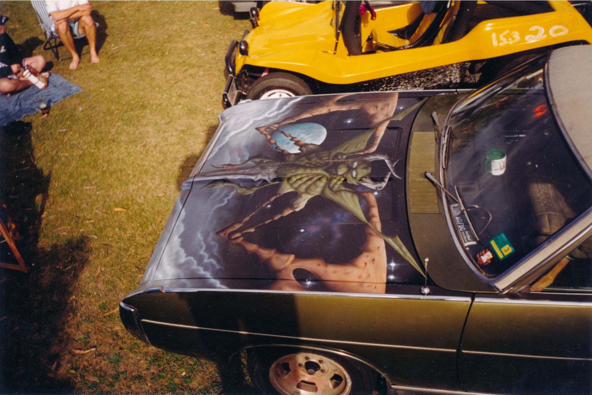 “Demon in Space” (1998) — Airbrushed automotive acrylic on a Chrysler Charger Some friends were heading down to the Bathurst 1000 from Queensland and wanted something to show off. The original plan was to paint the whole car, but time (and reality) meant we only finished the bonnet.