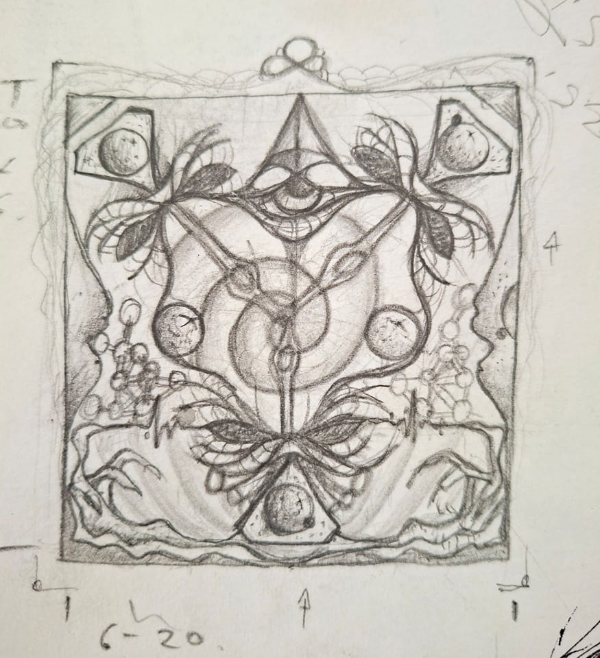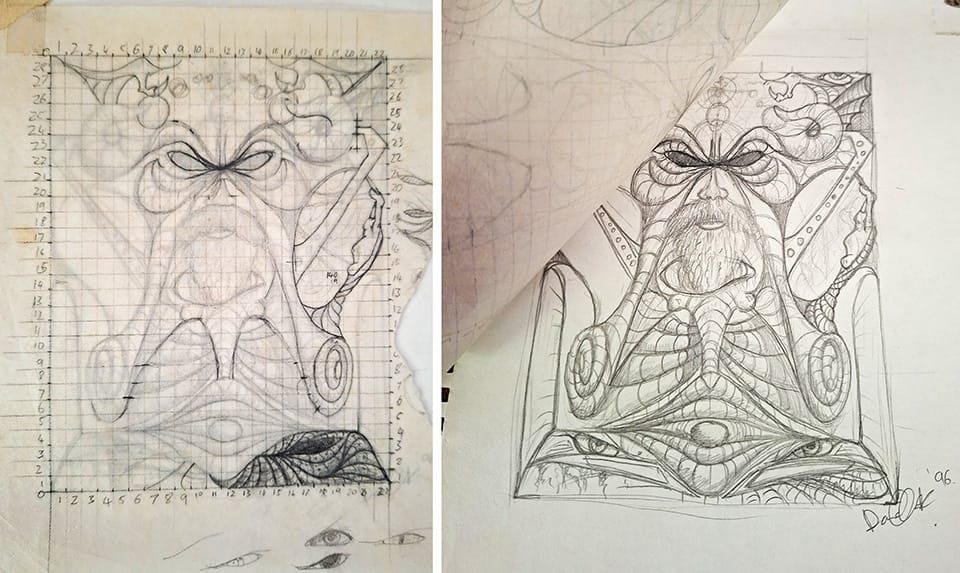 “One World Order” (1997) — Airbrushed acrylic on canvas board, 24" × 30" This is one of the more detailed pieces I attempted in the ’90s. It started as an A4 sketch, then I used tracing paper to build an old-school grid for enlarging it to the final size. Notice I added more detail on the overlay. (Below)